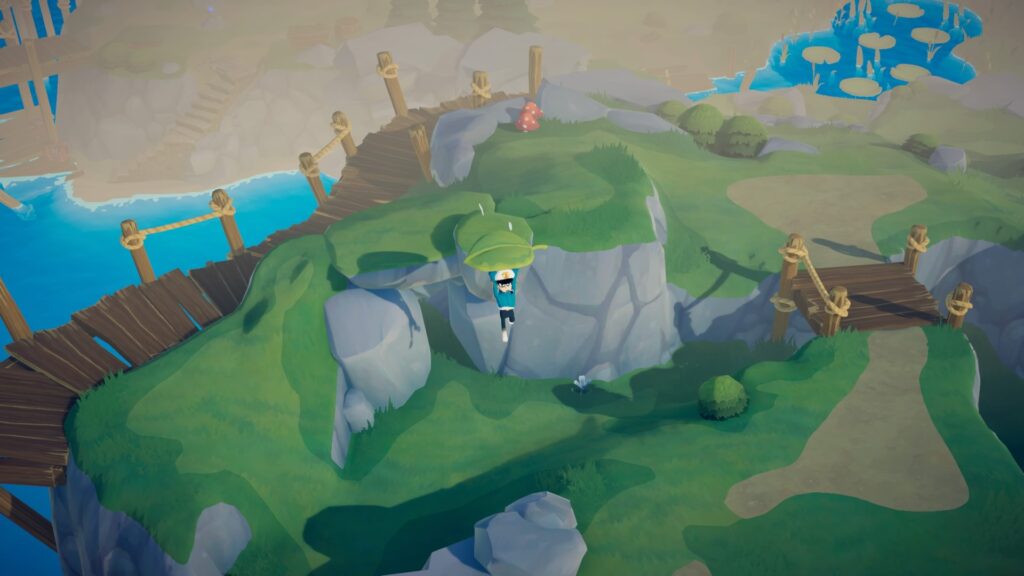 Claro que isto é dito de forma muito simplificada, pois estas mecânicas em conjunto com a exploração da ilha dá muito que fazer! Quase todos os objetos que consegues apanhar têm um propósito e utilidade para ti, como por exemplo umas enormes folhas que podes usar para planar ou as “flores hélices” que podes usar para correr extremamente rápido.